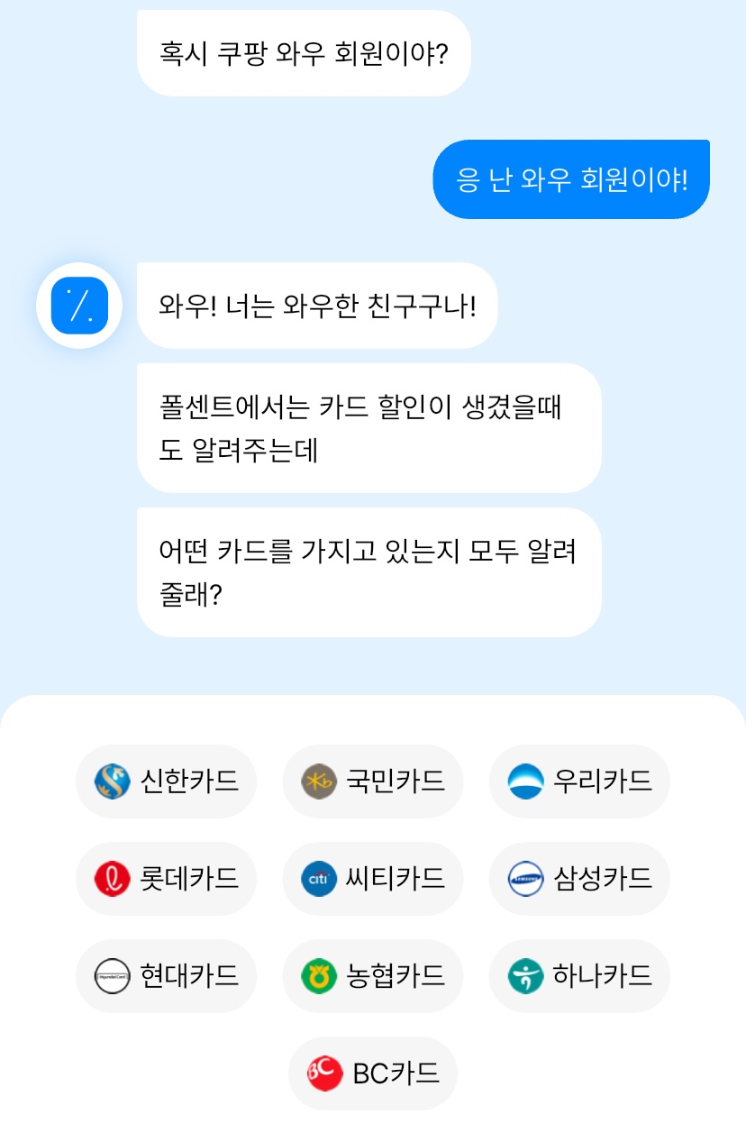 이렇게 앱을 설치하고 시작하자마자 AI대화창이 나와 사용법을 설명 해줍니다. 와우회원 여부와 카드설정 상품 공유법 등.